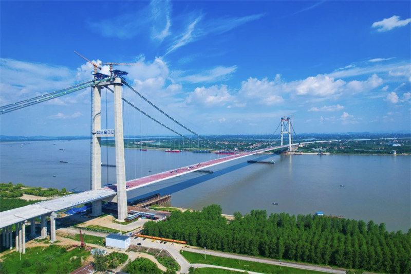 在追求“速度”的同时,生态保护成效同样显著。“双柳长江大桥选用了一跨过江的悬索桥设计方案”,大桥设计师介绍,大桥主桥桥墩设置在两岸,不在江水中打一根桩。为大桥主塔施工研发的一体化智能筑塔机,降低了施工中的噪声和扬尘;为避开水生动物活动高峰期,工地选择“错峰施工”。