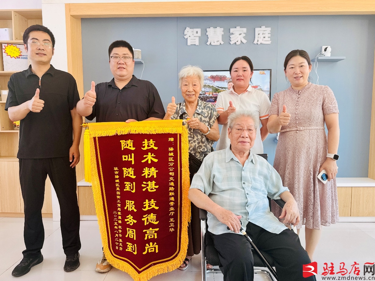 8月21日上午,烈日当空、酷暑难耐,家住市区菜园街工商局家属院的85岁高龄的杜学云夫妇,不顾年迈体弱,拄杖徐行、将一面书有“技术精湛 技德高尚 随叫随到 服务周到”字样的锦旗,郑重交至驻马店联通驿城区分公司营业厅工作人员手中,以此表达对联通智家工程师王卫华长期以来秉持热忱、细致周到的优质服务的高度赞誉与衷心感谢。