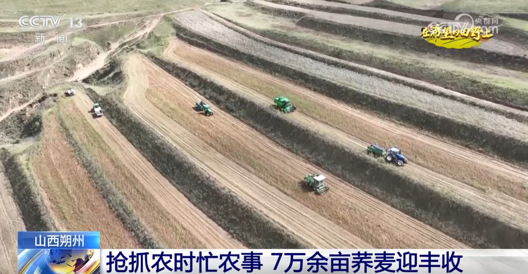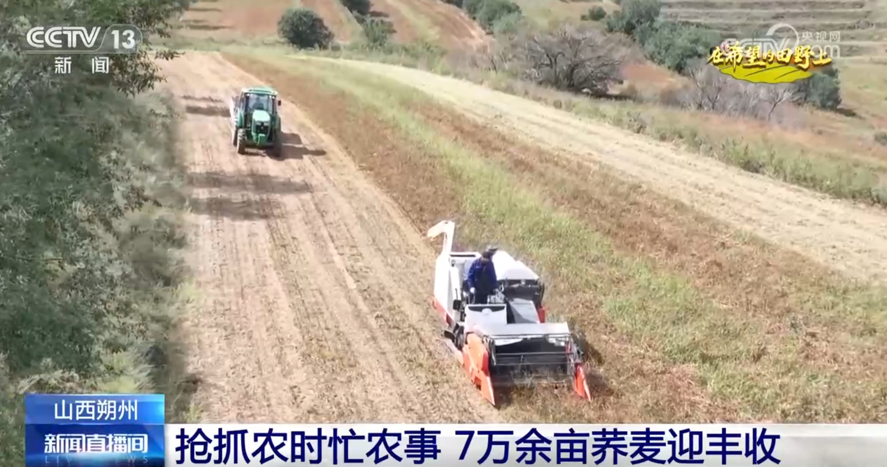 在朔州阻虎乡大干沟村的荞麦地里,一台台现代化大型收割机正在来回穿梭,将深褐色的籽粒装满拖拉机。